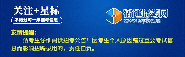招聘公告、拟聘用人员名单及实施过程中的有关通知、公告等需要公开的信息,在宿迁市宿城区人民政府网(宿城在线)(www.sqsc.gov.cn)、宿迁招考网(www.sqzkw.cn)发布,请考生随时关注相关信息,因考生个人原因错过重要信息而影响考试聘用的,责任自负。