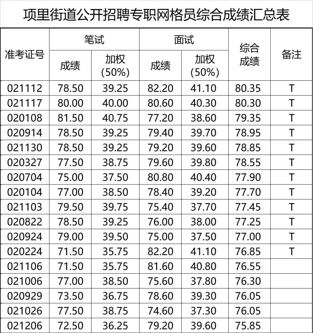 综合成绩如下表所示,公示时间3天。备注“T”表示进入体检环节,面试成绩“0”表示缺考。